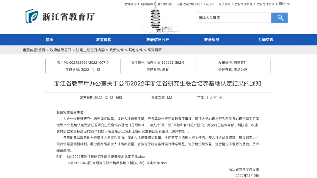 2022年12月12日,浙江省教育厅发布《关于公布2022年浙江省研究生联合培养基地认定结果的通知》,“杭州电子科技大学滨江创新中心研究生联合培养基地”获批为浙江省研究生联合培养基地。