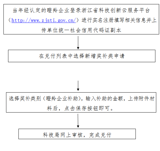 第九条:当年经认定的瞪羚企业须在科技创新云服务平台(www.zjsti.gov.cn)经注册后,进入创新券申领页面,点击“奖补类申请”,选择“瞪羚企业资助”,填写经审定的奖补金额后直接提交兑付申请。