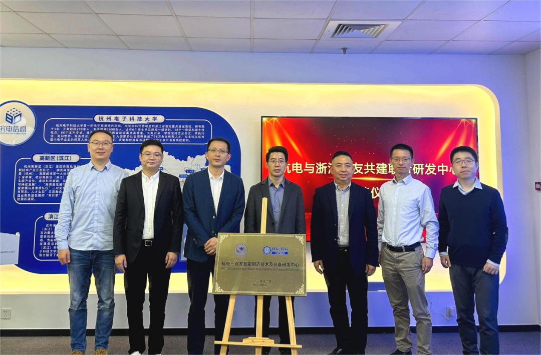 10月27日,「杭电-双友智能制造技术及装备研发中心」揭牌仪式在杭州电子科技大学滨江创新中心(研究院)隆重举行。浙江省科协智能制造学会联合体副秘书长周延锁、浙江省国际经济交流协会副秘书长蔡凤新、玉环市委组织部副部长李卫国、玉环市委组织部人才科科长许璐洋、杭州电子科技大学滨江创新中心副主任王思轩、杭州电子科技大学教授董源、浙江双友物流器械股份有限公司阮云波董事长等相关负责人共同出席此次活动。