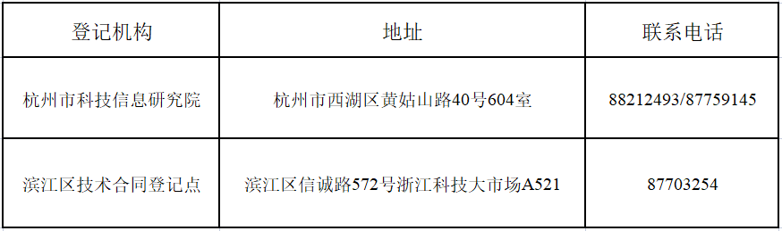 杭州市技术合同认定登记机构:杭州市科技信息研究院:88212493/87759145